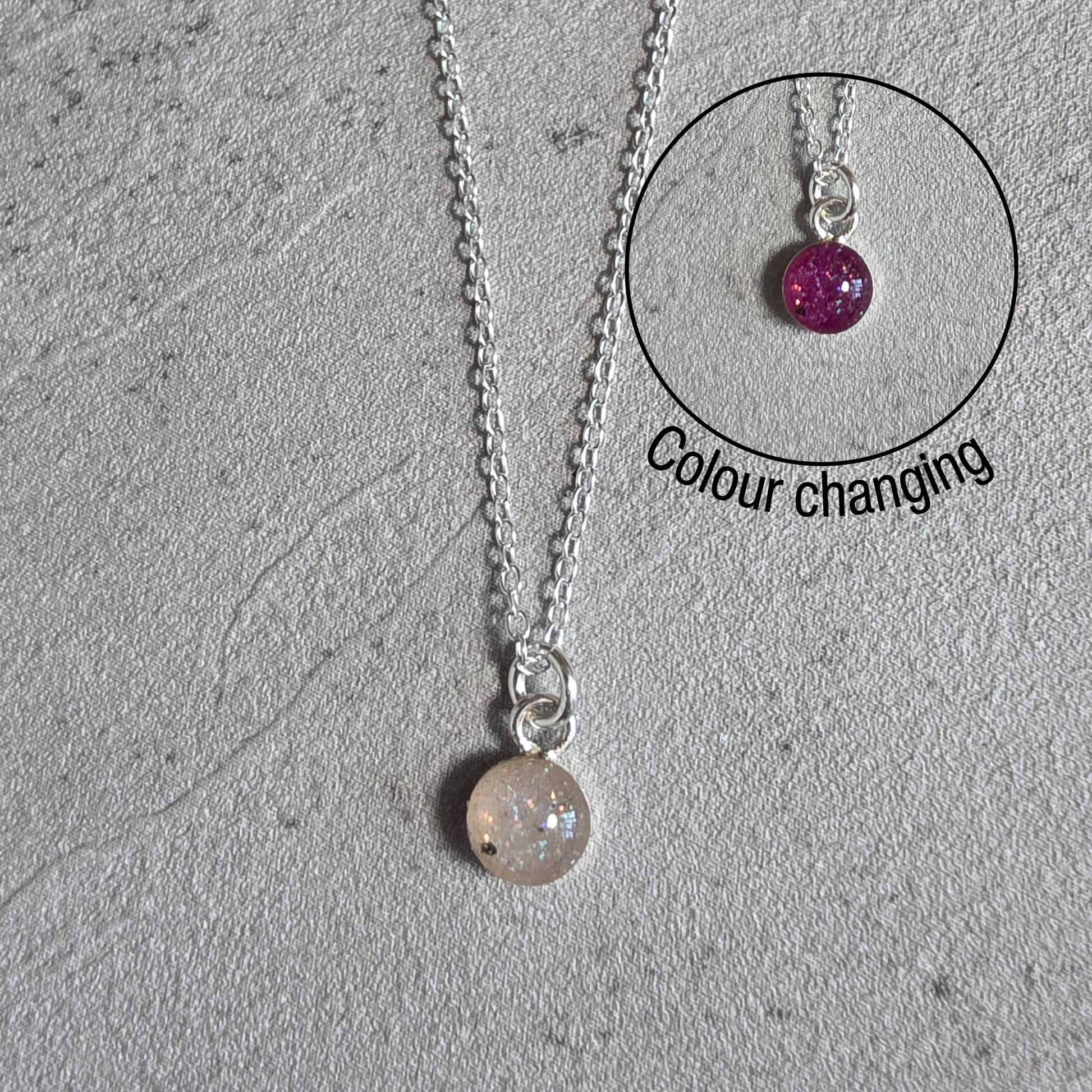 • UK Grade 925. Sterling Silver necklace with hand blown Lunar Dust Stone. Our Moon Dust is not loose in the pendant. It is blown into the pendants stone so you will never lose it.